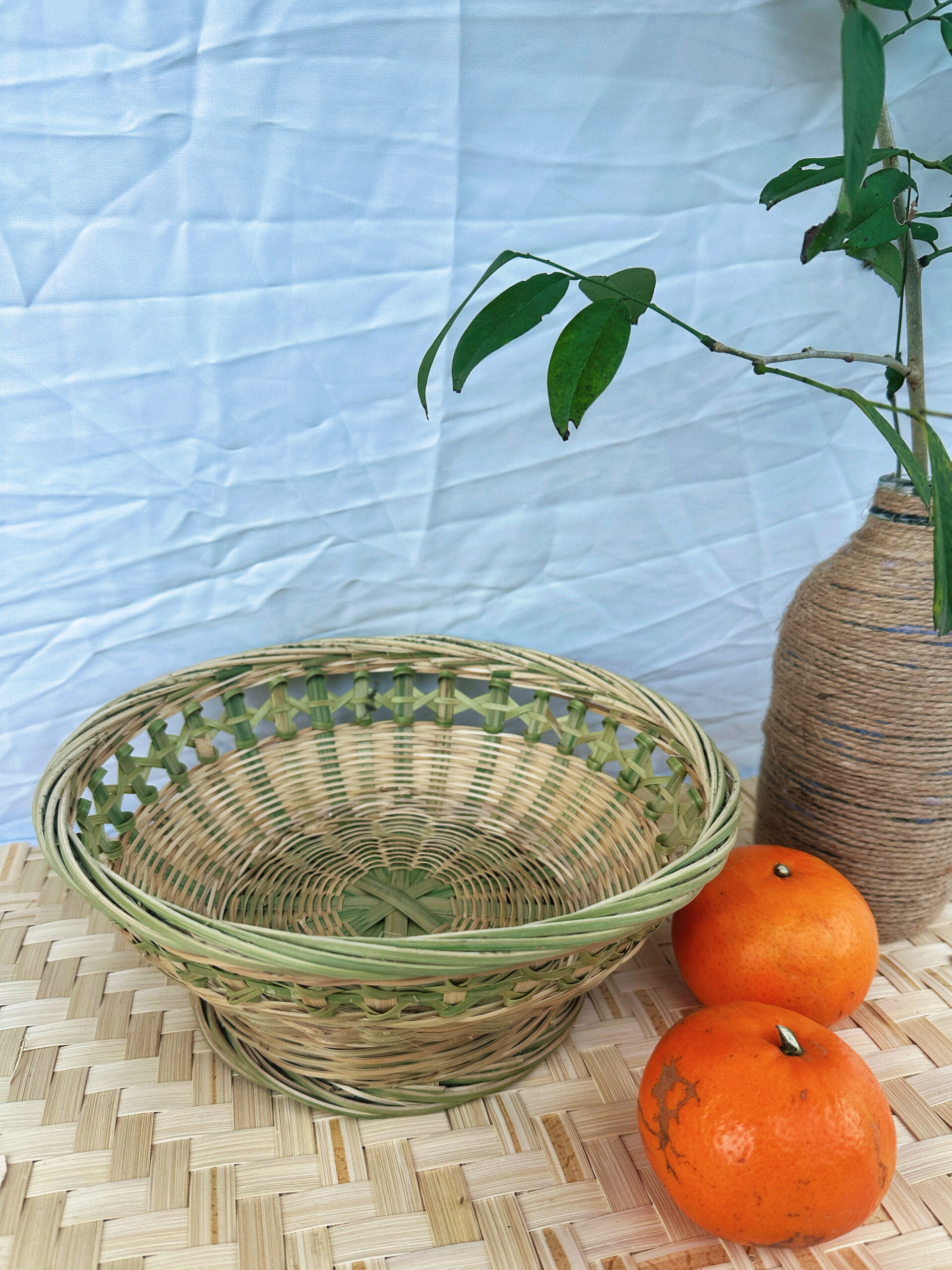 This handcrafted bamboo fruit basket is woven from carefully selected strips of green bamboo, combining traditional tight-weaving techniques with intricate openwork patterns. Its unique pedestal design not only adds a sense of three-dimensional depth to its form but also enhances its stability when displayed. Whether used to hold seasonal fruits and dried snacks, or to organize desktop sundries, this piece evokes an elegant, natural aesthetic—bringing the simple charm of rustic living right to your tabletop.