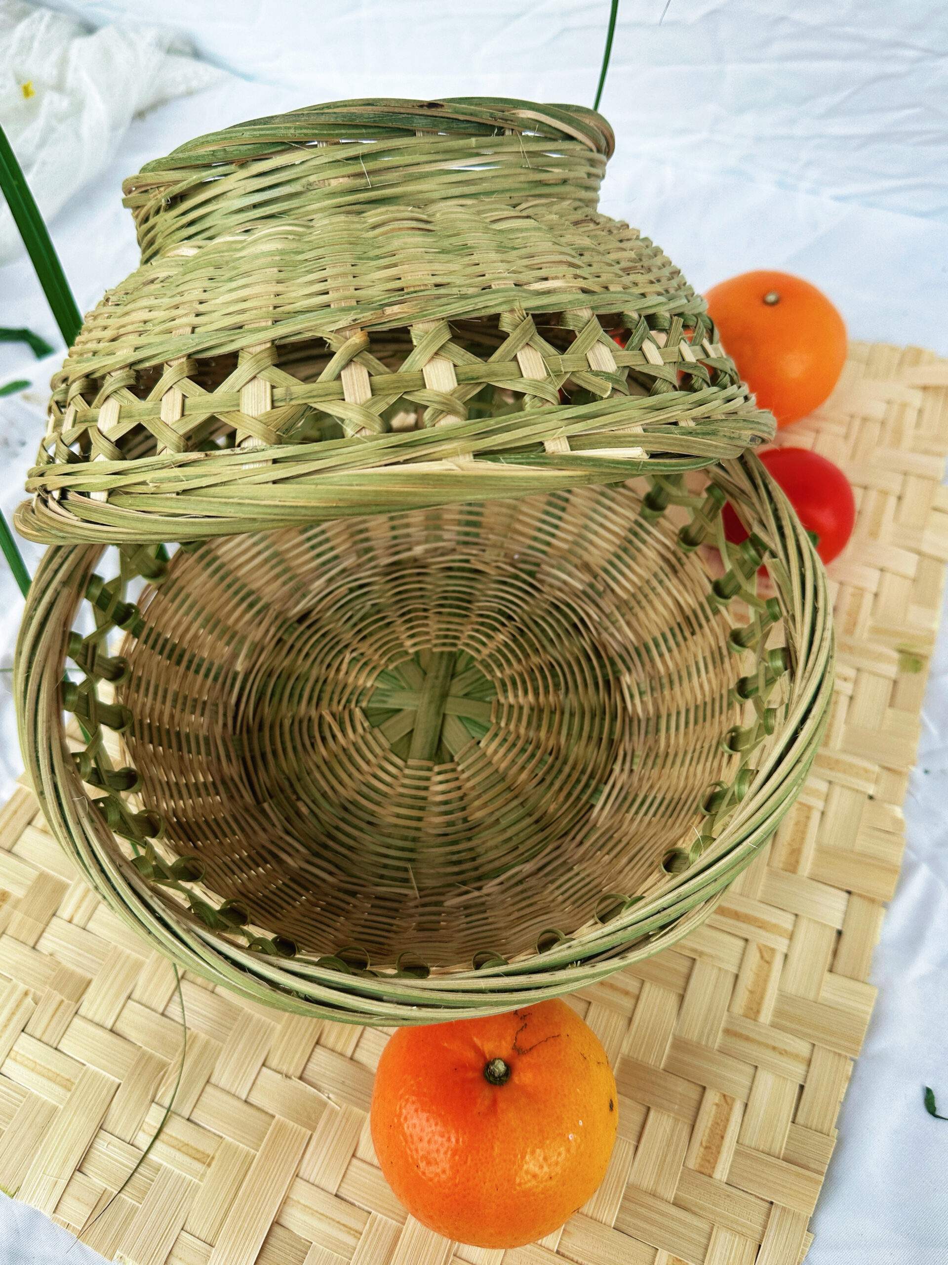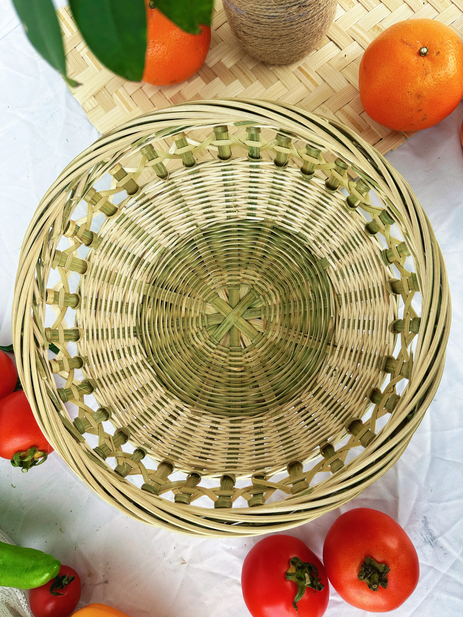 **Unique Openwork and Elevated Base Design:** The mid-section of the basket features a precise, cross-weave openwork pattern. This design not only ensures structural stability but also enhances the visual airiness and transparency of the piece. The elevated ring base lifts the basket off the surface, lending it a sense of ceremonial elegance while also facilitating airflow and ventilation beneath the basket—making it ideal for storing fresh fruits such as citrus or cherry tomatoes.